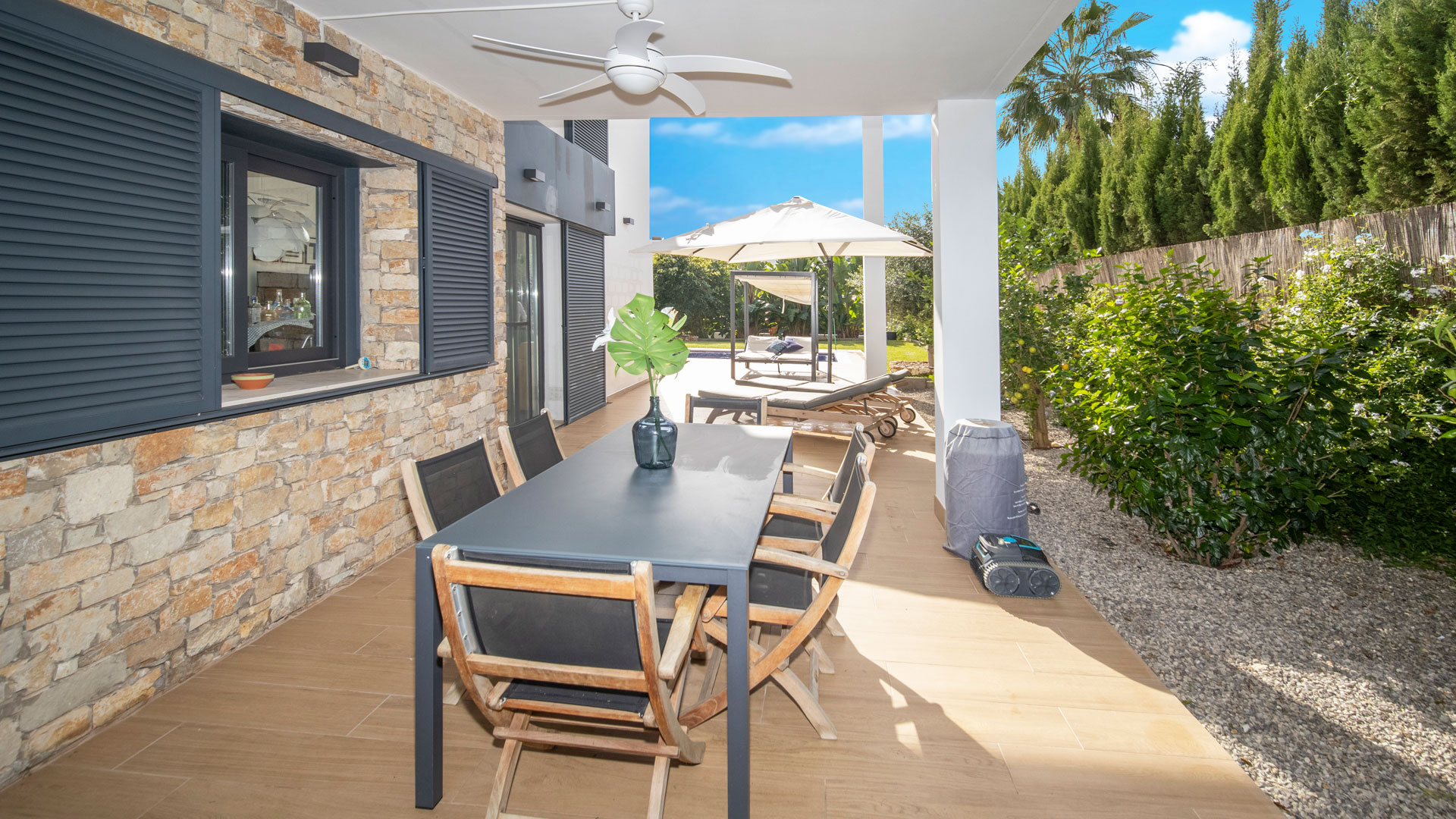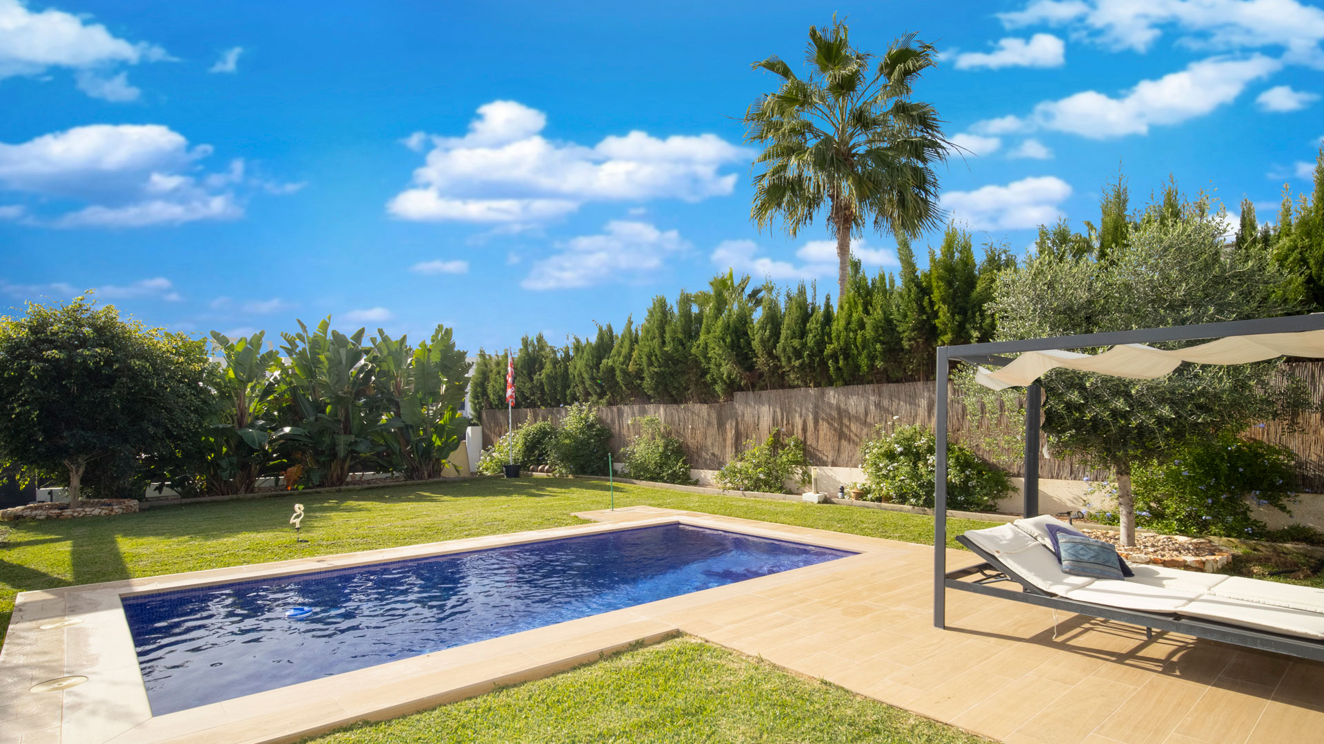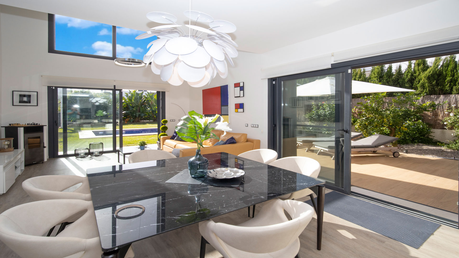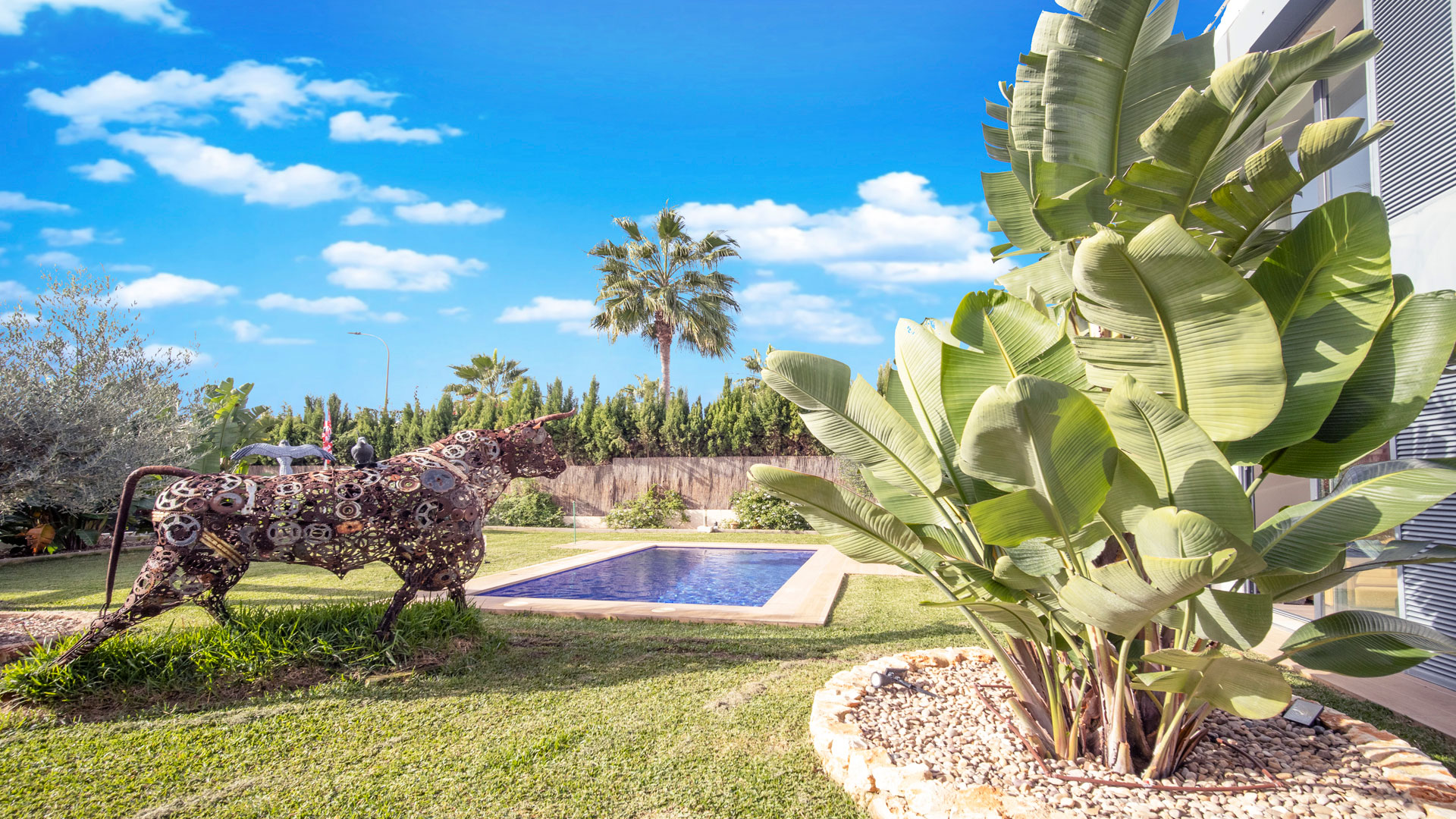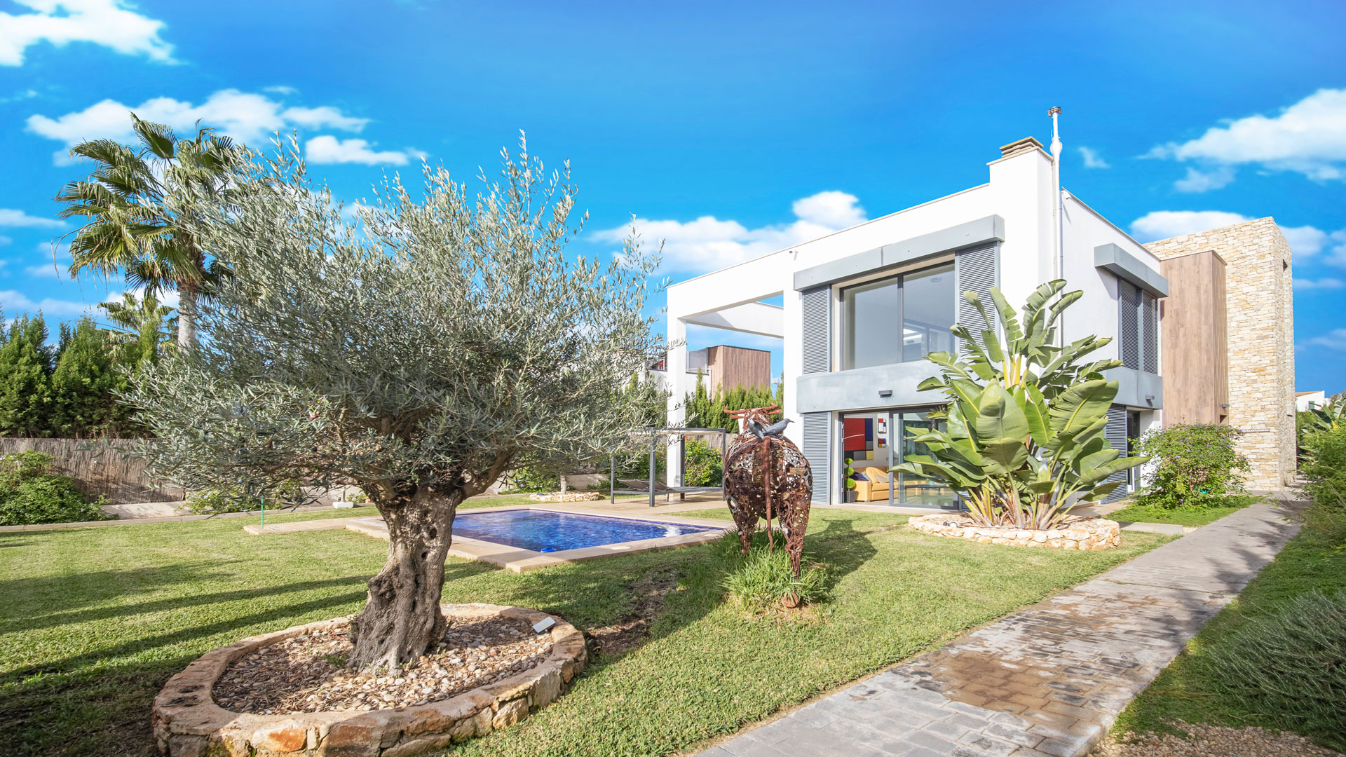 Bereits im Eingangsbereich empfängt Sie ein großzügiger Wohn- und Essbereich, der nahtlos in eine moderne, voll ausgestattete Küche übergeht – ideal für gesellige Abende mit Familie oder Freunden. Von hier aus öffnet sich der Blick auf einen traumhaft angelegten Garten: Zypressen, die absolute Privatsphäre gewährleisten, duftende Zitronen- und Orangenbäume, Olivenbäume, Hibiskus oder meterhohe Strelitzien verleihen dem Außenbereich eine exklusive, tropisch-mediterrane Atmosphäre. Mehrere teilweise überdachte Terrassen und der elegante Pool mit Rasenfläche laden zum Entspannen und Genießen ein – vom Frühstück in der Morgensonne bis zu lauen Sommerabenden unter dem Sternenhimmel.