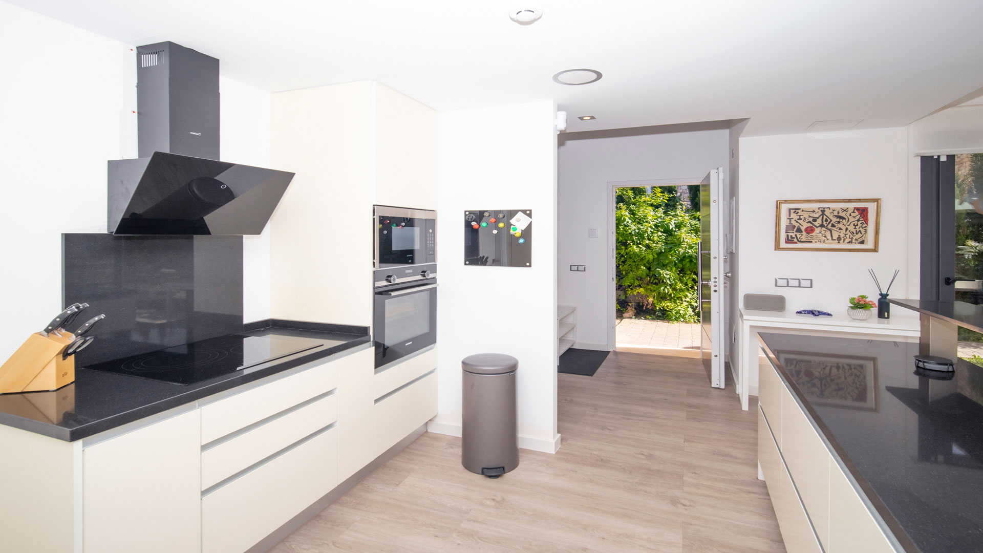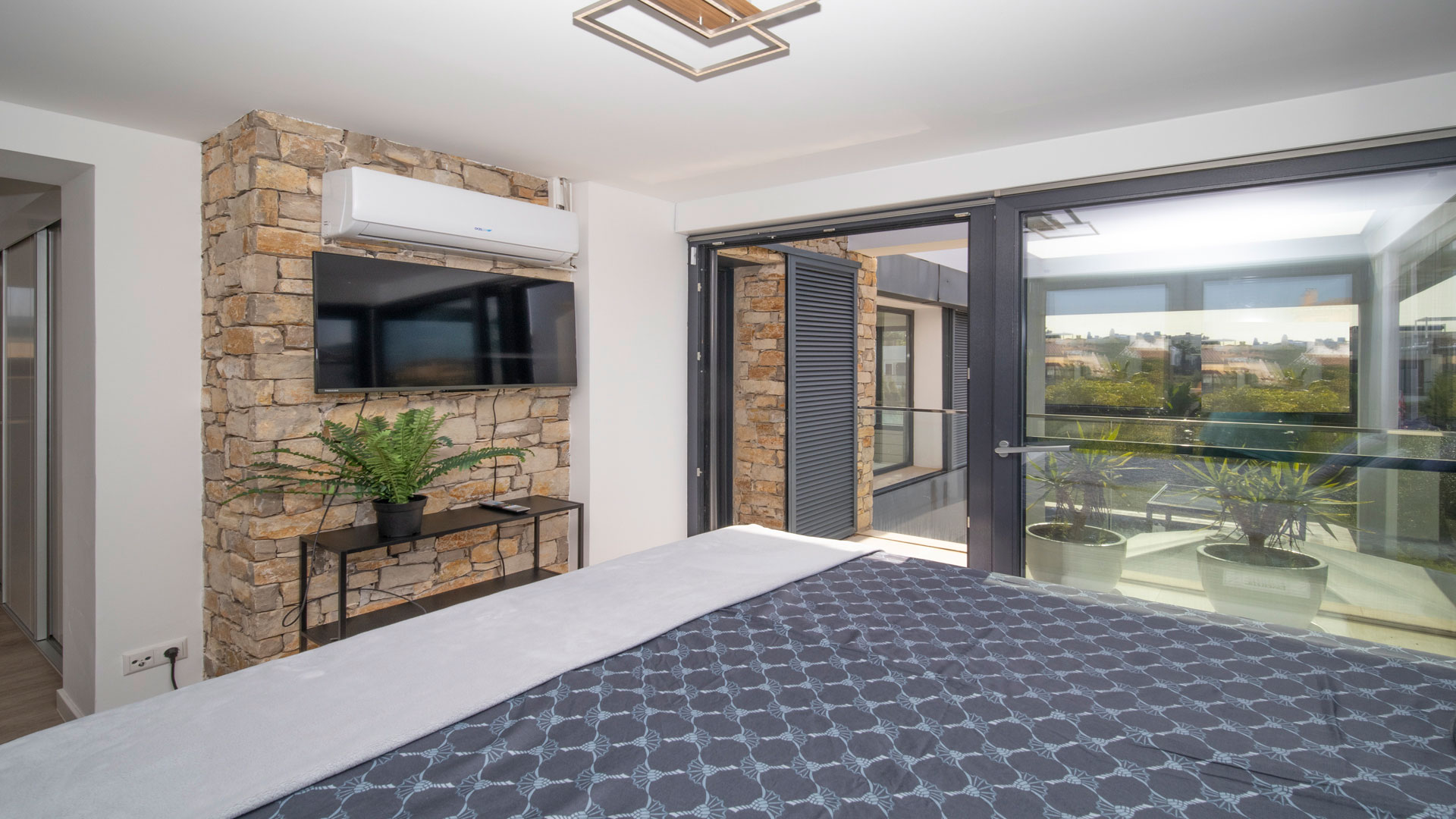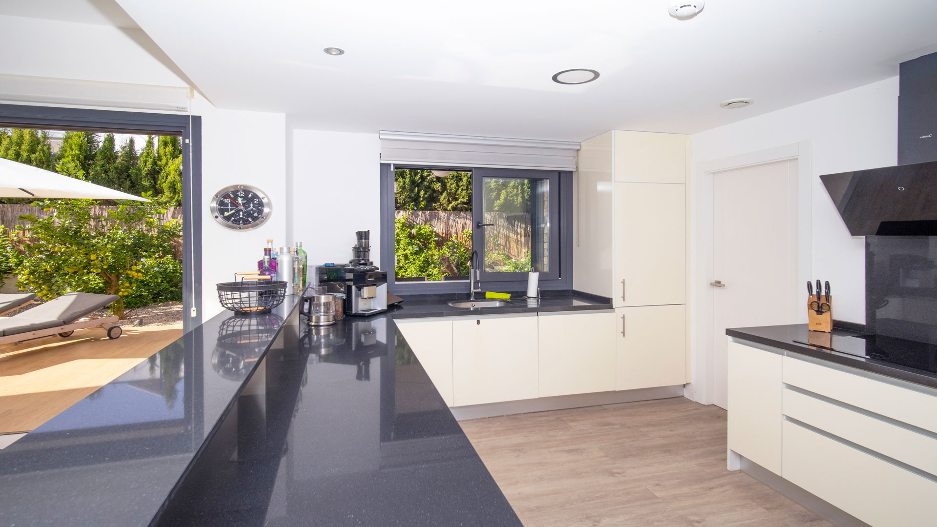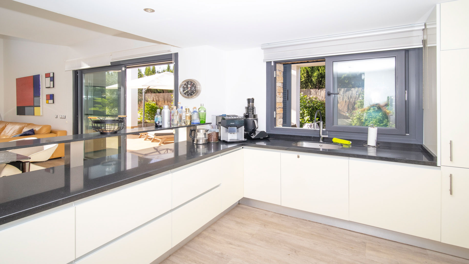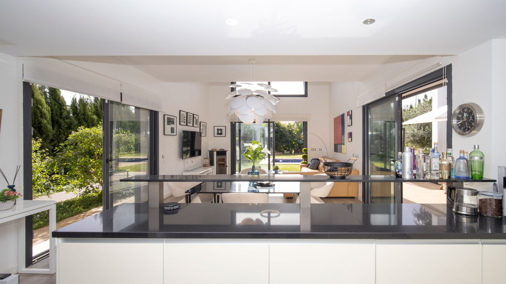 Bereits im Eingangsbereich empfängt Sie ein großzügiger Wohn- und Essbereich, der nahtlos in eine moderne, voll ausgestattete Küche übergeht – ideal für gesellige Abende mit Familie oder Freunden. Von hier aus öffnet sich der Blick auf einen traumhaft angelegten Garten: Zypressen, die absolute Privatsphäre gewährleisten, duftende Zitronen- und Orangenbäume, Olivenbäume, Hibiskus oder meterhohe Strelitzien verleihen dem Außenbereich eine exklusive, tropisch-mediterrane Atmosphäre. Mehrere teilweise überdachte Terrassen und der elegante Pool mit Rasenfläche laden zum Entspannen und Genießen ein – vom Frühstück in der Morgensonne bis zu lauen Sommerabenden unter dem Sternenhimmel.