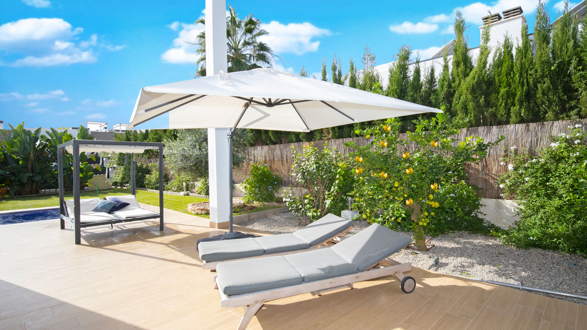 Die gepflegte Urbanisation bietet zahlreiche Grünflächen und einen großzügigen Gemeinschaftsbereich, den Sie bequem zu Fuß erreichen. Hier erwartet Sie ein beeindruckender 400 m² großer Überlaufpool mit Relax-Liegen, eine ca. 2.800 m² große Rasenfläche mit Sonnenschirmen, ein Gemeinschaftshaus und ein Spielplatz – ein echtes Paradies für Groß und Klein.